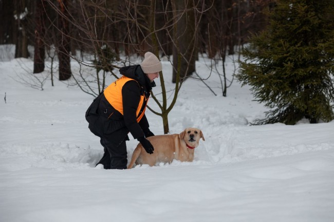 Основная задача зимой – отработка навыков поиска людей при отрицательных температурах в снегу. Роль условных пострадавших выполняют статисты из числа кинологов-волонтеров. Эти люди умеют разбираться в поведении собак, чтобы не навредить системе подготовки и помочь животному в поддержании интереса к тренировкам. Собаки, используя нюх, учатся не только находить человека, но и правильно передвигаться по глубокому снегу, удерживать частоту дыхания для сохранения возможности облаивать статиста до подхода своего хозяина, экономя физические силы.