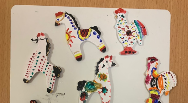 Дети расписали в стилистике дымковской игрушки основы для значков, которые заранее были сделаны в столярной мастерской «Умелец». Фотографии можно посмотреть по ссылке.